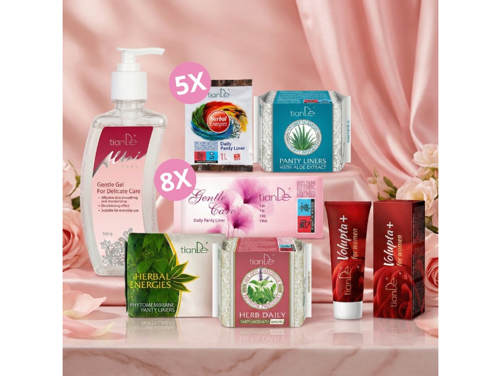 Součástí balíčku je kombinace bylinných denních vložek TianDe, které poskytují jemnou, ale dlouhodobou lokální podporu. Jednotlivé typy se liší intenzitou a zaměřením: