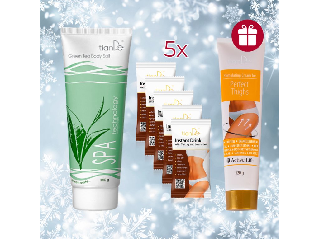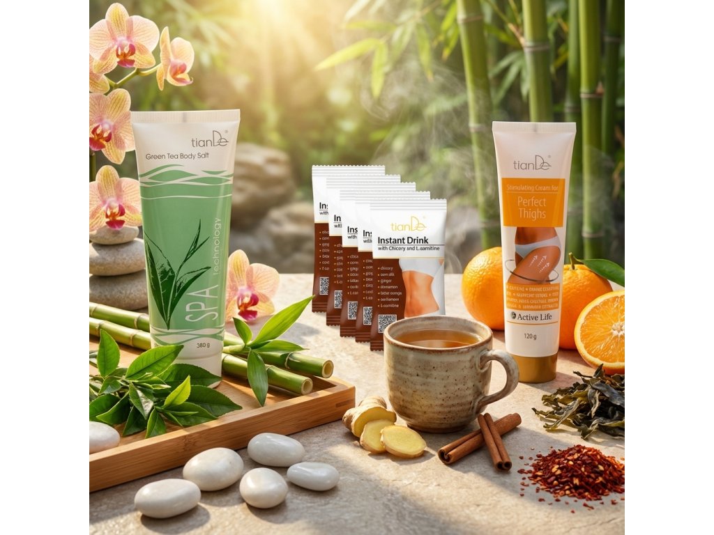 Tento balíček propojuje očistnou a tvarující tělovou péči ve stylu domácího SPA s funkčním nápojem podporujícím metabolismus a cíleným krémem na problematické partie. Vše v souladu s filozofií značky TianDe.