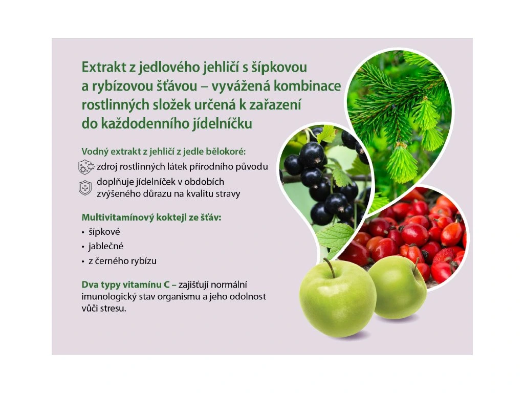Extrakt z jedlového jehličí se šípkovou a rybízovou šťávou je vyvážená kombinace rostlinných složek inspirovaná přírodou, určená k zařazení do každodenního jídelníčku jako součást zdravého životního stylu. Spojuje vodný extrakt z jehličí jedle bělokoré s ovocnými šťávami (šípek, jablko, černý rybíz) a vitamínem C – ideální volba zejména v obdobích zvýšené zátěže nebo při sezónních změnách, kdy chceme věnovat péči svému režimu a výživě.