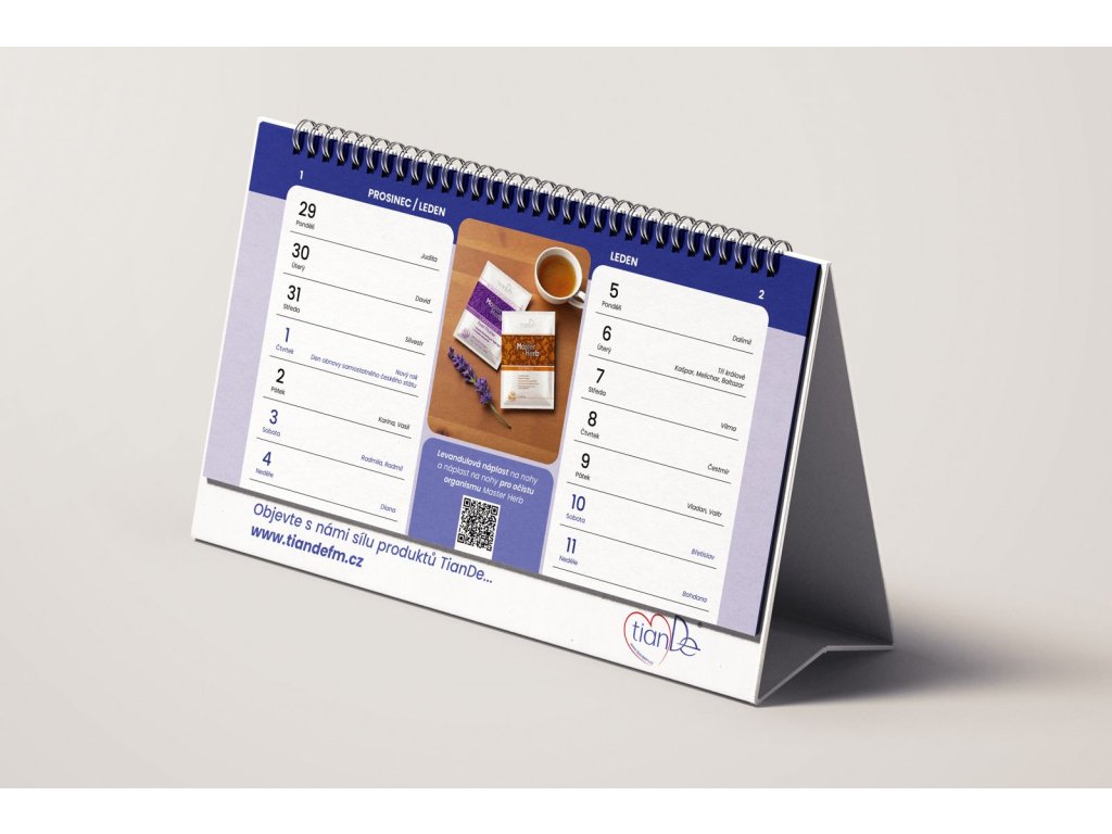 Stolní kalendář na rok 2026 s motivem různých produktů TianDe, včetně QR kódů, kde najdete popis jednotlivých produktů.