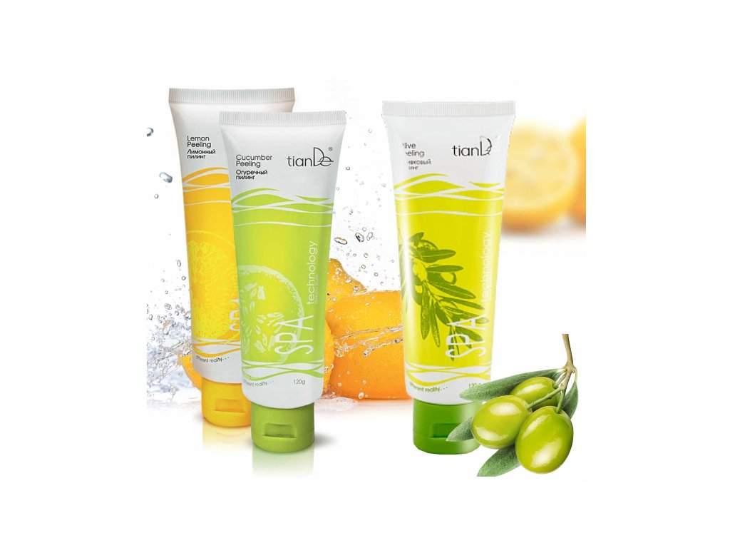 Peeling - exfoliant s olejem z olivových plodů a obsahem kolagenu čistí pokožku díky mechanickému působení na principu rolování, a kromě toho má zvýšenou účinnost díky působení AHA ovocné kyseliny. Jablečná kyselina rozpouští mezibuněčné vazby mezi zrohovatělými šupinkami, a tím napomáhá jejich dalšímu odstranění. Olej plodů olivovníku zlepšuje napětí pleti a vyhlazuje drobné vrásky.