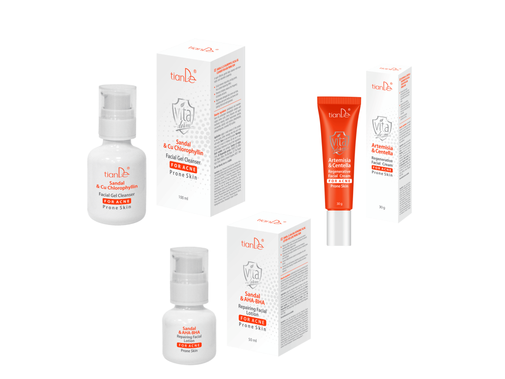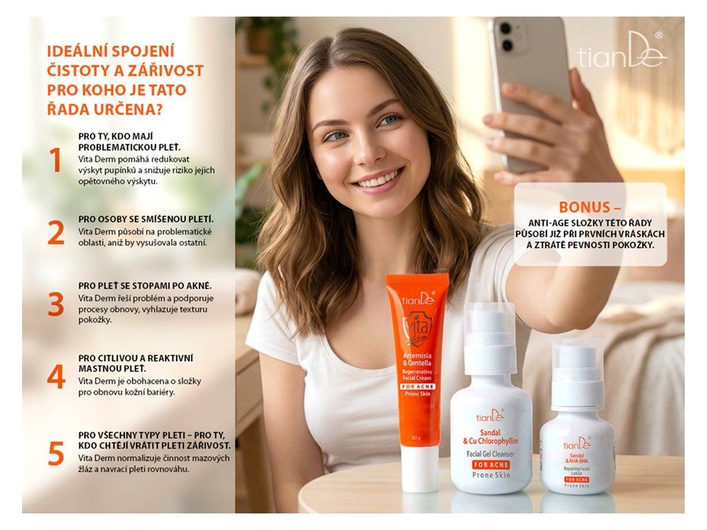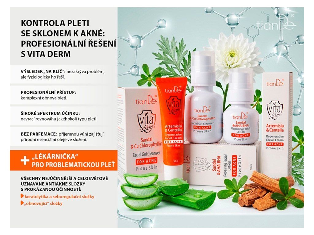 VitaDerm: Profesionální 3krokový set pro pleť se sklonem k akné Bojujte proti nedokonalostem a akné silou přírody a moderní vědy. Tento set je navržen pro absolutní komfort problematické pleti – hloubkově čistí, reguluje tvorbu kožního mazu a urychluje hojení. Ideální pro pleť, která trpí podrážděním, potřebuje rychle zklidnit a zbavit se stop po akné.