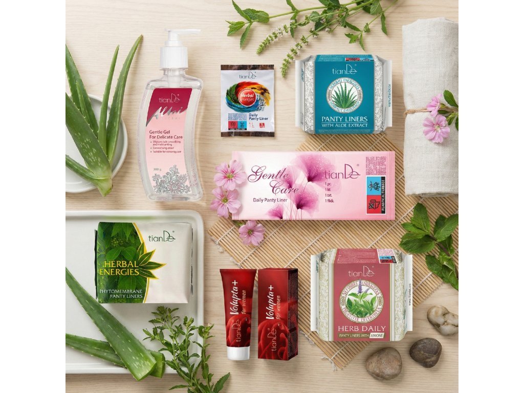 Součástí balíčku je kombinace bylinných denních vložek TianDe, které poskytují jemnou, ale dlouhodobou lokální podporu. Jednotlivé typy se liší intenzitou a zaměřením: